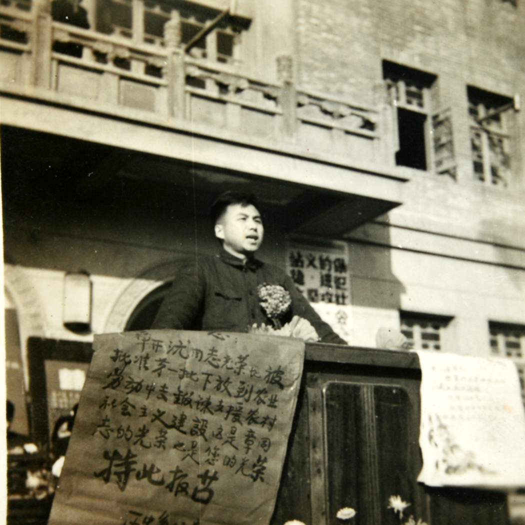1957年12月,我被下放到湖北省当阳县国营草埠湖农场劳动。我至今仍保留有当时表决心的一张照片。照片中,我站在华师一号教学楼前发言,胸前戴着大红花,桌前摆着一张大喜报。喜报是历史系送给我妻子怀玉的,上面写着:“章开沅同志光荣地被批准第一批下放到农业劳动中去锻炼,支援农村社会主义建设。这是章同志的光荣,也是您的光荣。特此喜报!”