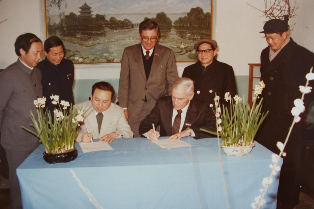 我听从了他的建议,首先恢复与耶鲁的历史因缘,然后往中、往南发展。这一战略果然有效,中部和南部的发展空间确实很大。像位于田纳西州的孟菲斯大学,原来一直与台湾打交道,可以说是亲台的。后来整个形势变化了,对新中国渐渐有好感了,但苦于没有沟通的渠道。刚好,我们学校外语系杨亲德老师在中国驻美大使馆教育处任一秘,田纳西州恰好在他工作辖区,为我校牵线搭桥,很顺利地就建立起了联系。签订协议的时候,非常隆重,当地的电台和报社都来了,田纳西州州长还送我一个“荣誉公民”的称号,因为这是他们州与新中国的部属大学首次签署学术交流协议。