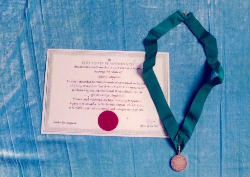 英国剑桥世界名人传记中心授予章开沅“世界500人”纪念章与证书