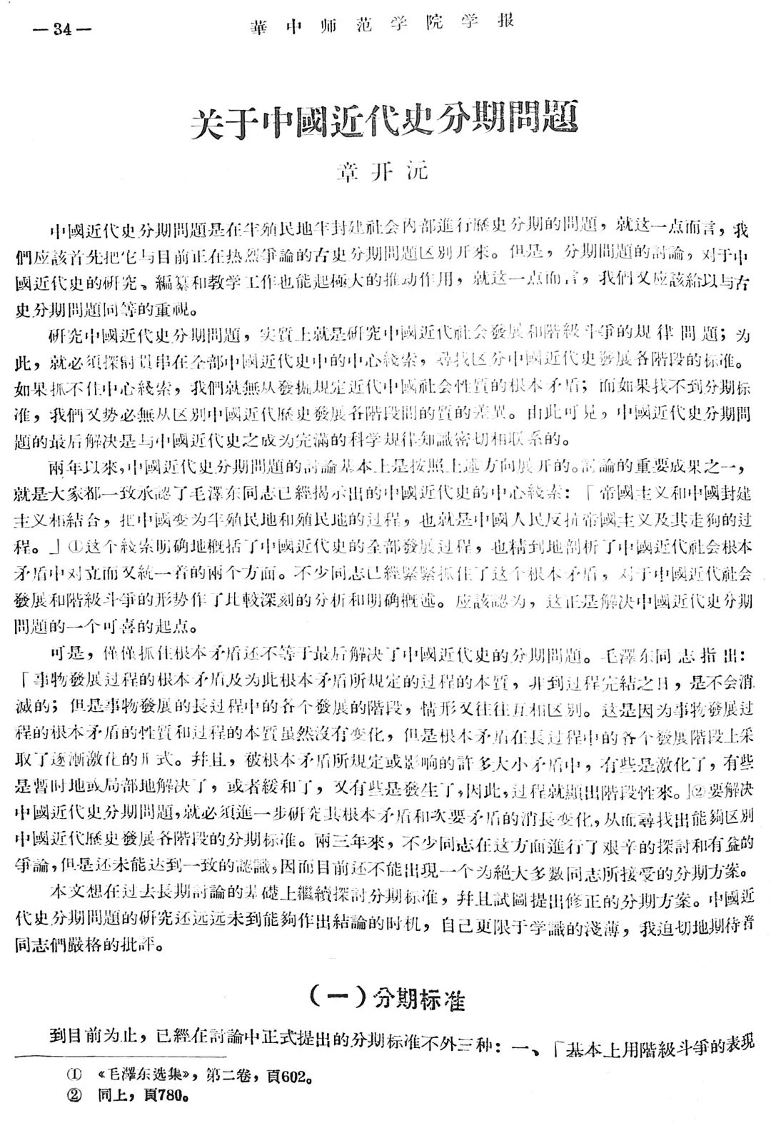 新中国成立不久,史学界有一场关于中国近代史分期的大讨论。这缘于历史学家胡绳在1954年《历史研究》创刊号发表了《中国近代历史的分期问题》一文。胡绳在文中首次提出了中国近代史“以阶级斗争的表现”为分期标准和“三次革命高潮”的论断,立即引起了全国史学界的热烈讨论。那时候,大家有话就说,不管年岁少长、地位高低,都是直来直去,指名道姓,丝毫不讲客套。因此,尽管有范文澜、胡绳等学界前辈著文在先,戴逸、金冲及等史学新锐长文在后,开沅师仍然抱着极大的热情和勇气撰文争鸣。机缘巧合,《华中师范学院学报》1955年春天创刊,破土而出。开沅师将自己1956年秋完成的长达3万字的《关于中国近代史分期问题》投送给学报。学报与它的重要作者章开沅先生就这样不期而遇了。