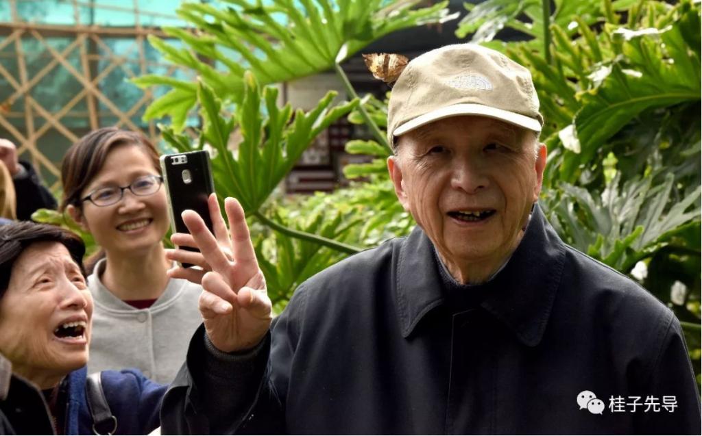 一只蝴蝶落在章先生的帽子上,大家纷纷拍照。