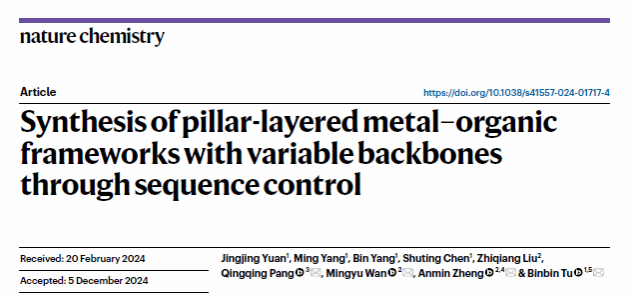 华大在线讯(通讯员 周汉鸣)近日,化学学院涂斌斌副教授团队在金属有机框架序列调控方面取得了重要进展。该研究成果在国际化学领域权威期刊《自然化学》(Nature Chemistry)发表,题为“Synthesis of backbone variable pillar-layered metal–organic frameworks through sequence control”(Nat. Chem. 2025, 17, 421-428)。博士研究生元静静为论文第一作者,通讯作者为武汉科技大学庞青青讲师、万明宇特任教授、郑安民教授和我校涂斌斌副教授(最后通讯作者),第一完成单位为华中师范大学。