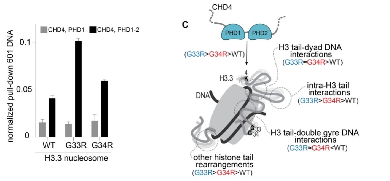 团队聚焦肿瘤相关组蛋白突变机制,联合国际合作者结合核磁共振与分子动力学模拟,揭示H3.3 G34R突变在核小体环境中显著重塑组蛋白尾部的构象集合与动力学特征,并通过改变尾部-DNA相互作用模式,进一步影响染色质重塑因子等调控蛋白的结合行为与功能输出(图1)。同时,针对连接组蛋白H1的高频肿瘤突变,团队整合结构信息与交联质谱数据开展跨尺度研究。结果表明,突变富集于关键结合界面,可重塑相互作用网络拓扑并削弱H1相互作用,从而可能引发染色质高阶结构失稳与表观调控异常。相关成果发表于《Nucleic Acids Research》和《Biophysical Journal》。