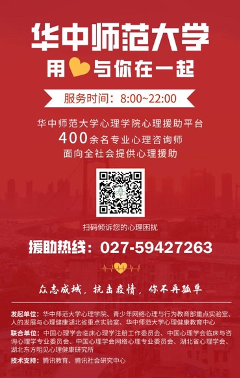 华中师范大学心理学院面向所有受到疫情影响人员,包括一线医务人员、被隔离人员、受感染人员、康复患者、大中小学师生和普通民众开设心理援助热线: