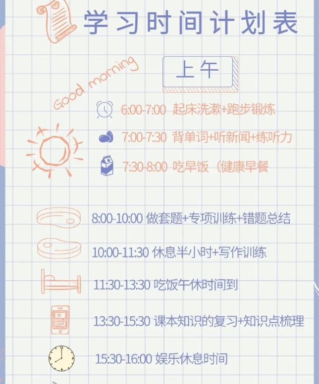 学习时,可以把一个计划分成多个小步骤,在每个小步骤边标上所要花费的时间,时间一般是15-30分钟左右。规划好之后,学习者可以通过逐一推进目标的方法促使自己及时完成任务,告别拖延。集中精力在规定的时间内把这一个小步骤做完,这样把一项学习任务分成多个小的步骤,完成了也会有动力,中途还可以休息一下。